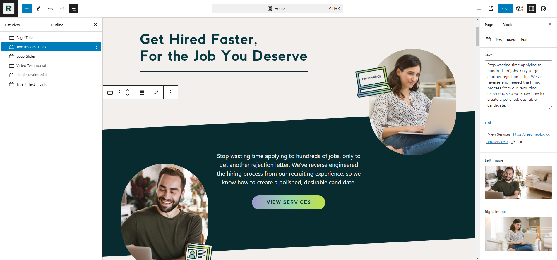 This is an example of the home page on the Resumeology website that is built entirely using custom blocks.