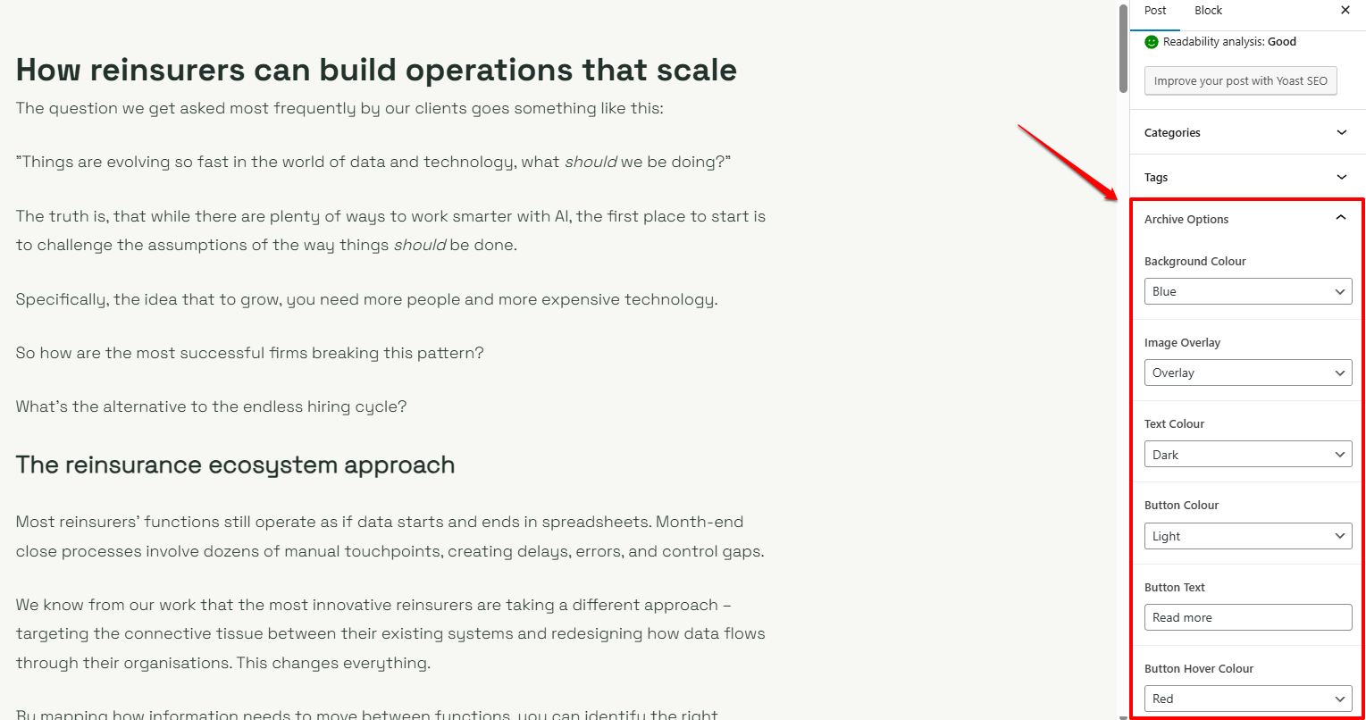 Some images will be lighter and will require a darker text colour, and some images will be darker and require a lighter text colour. So to resolve this issue, I added custom fields to each blog post so that the client can easily customise the colour of the text. They can choose from either “Light” or “Dark” for the text colour.