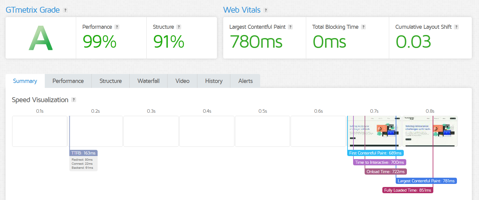 I always build my WordPress websites with speed in mind, and Toucanberry Tech was no exception. Just look at these speed test results from GTmetrix: fully loaded in 0.8 seconds!